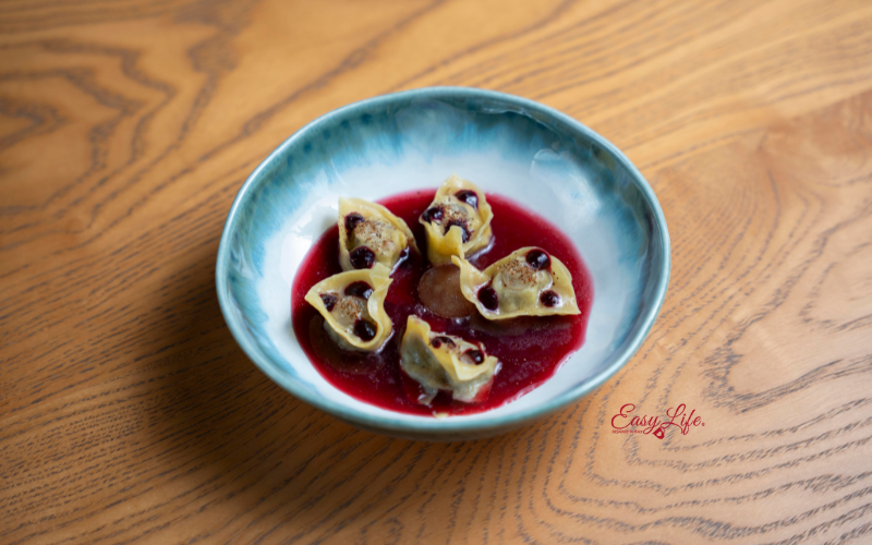 Raviolo di guancina, brodo ai frutti rossi e gin