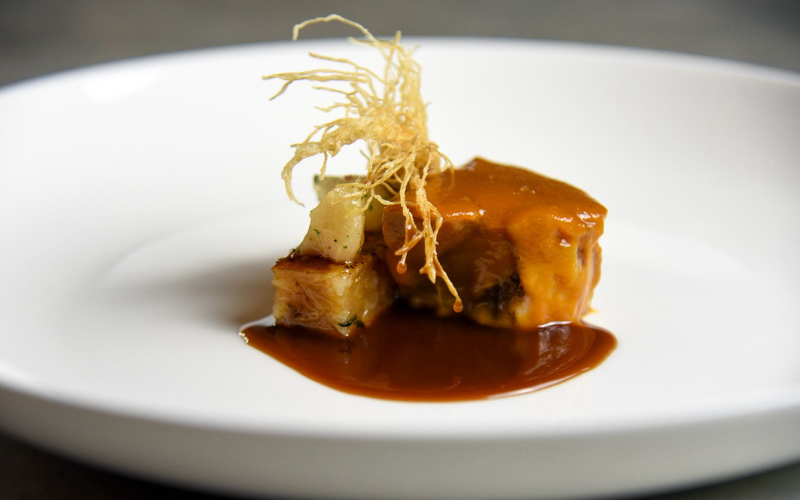 Stinco di vitello cotto al fieno, Tatin di cipolla al marsala